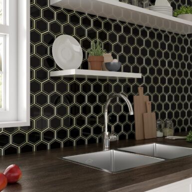 Livelynine Tegelstickers Badkamer Zwart Goud Zelfklevende Tegels Keukenmuur Zeshoek 3D Waterdichte Muurtegels Om Te Plakken 30.5×30.5CM, 4 Stuks